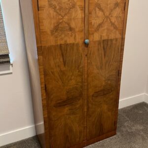 Spacious Solid Wood Armoire with 3 Drawers and Cabinet with Shelves (SKU# CB5/907): Sturdy and in beautiful condition! Top 2 drawers work well and stay level when pulled out. Cabinet doors close securely. 40″ wide x 18″ deep x 61″ tall.
