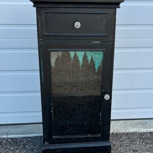 TALLER Dark Brown Solid Wood Cabinet with Shelves and White Fleck Formica Top (SKU# CB5/827): Sturdy and in great condition! cabinet doors open and close securely. 37.5″ long x 20″ deep x 36″ tall.