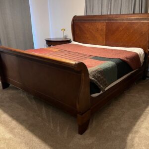 Large 3-Drawer Espresso Wooden Bedside Table: Sturdy and in good condition, with some wear to the finish on top. We will try to touch this up prior to selling it. 29″ wide x 17″ deep x 28″ tall. $95