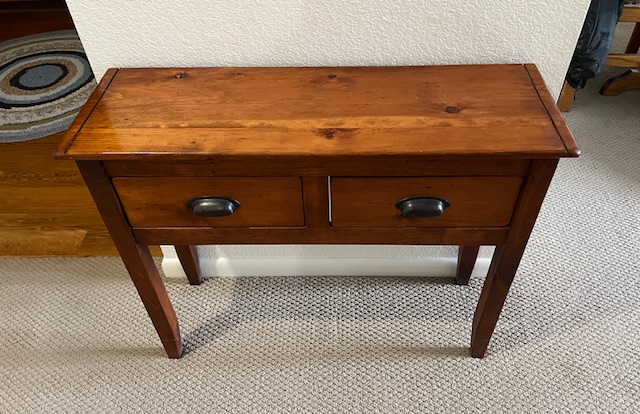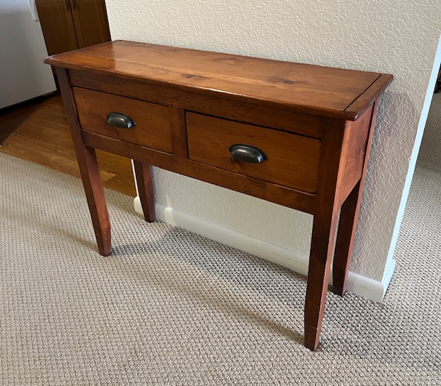 Two-Drawer Solid Wood Entryway Table with Curved Drawer Pulls (SKU# CB6/137): Sturdy and in excellent condition! 36″ long x 19″ deep x 29″ tall.